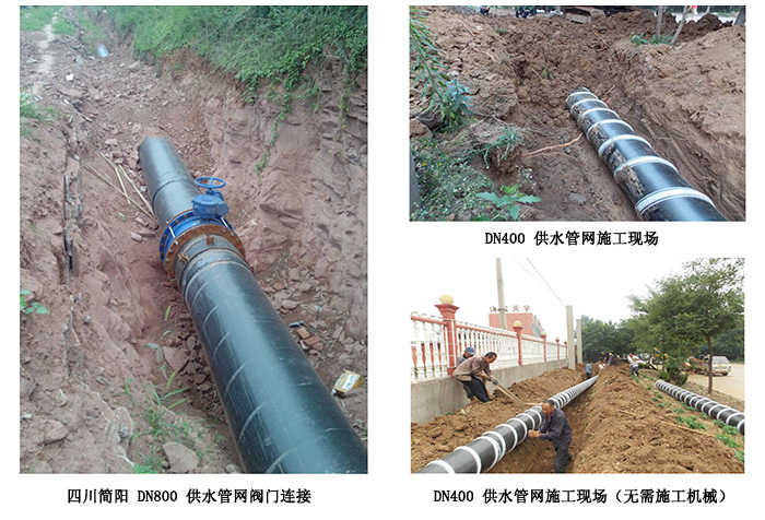 在工程施工方面,大口径完美电竞·(中国) 竞技平台管也占很大优势。钢丝缠绕超高完美电竞·(中国) 竞技平台管的比重约为1.2,而由于其壁厚很薄,直径可以小一号,其重量比铸铁管和PCCP管小5—10倍,搬运和安装非常轻便。超高完美电竞·(中国) 竞技平台复合管的柔韧性很好,可以先在地面上连接好之后再下到管沟里,边挖沟边下管,边填埋。不用修路,不用大型机械,不用地基处理。铸铁管和PCCP管必须挖很宽的沟,管道下到沟里对正连接,受到很大局限,工程费用大幅上涨。在需要穿越江河的情况,超高分子量聚乙烯完美电竞·(中国) 竞技平台管可用沉入法在江河底敷设,也可用拖拉法从江底隧道或管道中拖曳而过,这都是铸铁管和PCCP管做不到的。