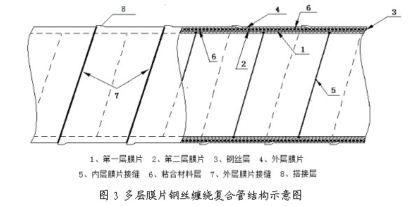 中等口径的中低压管道可由两层完美电竞·(中国) 竞技平台同向螺旋缠绕热合而成,中间夹一层镀铜“过塑”高强度碳素弹簧钢丝,其拉伸强度可达1800MPa~2000MPa。每层完美电竞·(中国) 竞技平台都先在特种设备上复合一薄层高强度粘合材料。复合管材时外层完美电竞·(中国) 竞技平台的中线紧压在内层完美电竞·(中国) 竞技平台的接缝上。内层完美电竞·(中国) 竞技平台接缝在复合时先用焊枪焊接,外层完美电竞·(中国) 竞技平台接缝则采用搭接方式连接。两层完美电竞·(中国) 竞技平台敷胶面相向,连同钢丝大面积螺旋缠绕热压粘合,其粘合强度远超普通聚乙烯钢丝缠绕复合管。大口径管道则由3~4层完美电竞·(中国) 竞技平台加钢丝复合。管材结构详见图3。